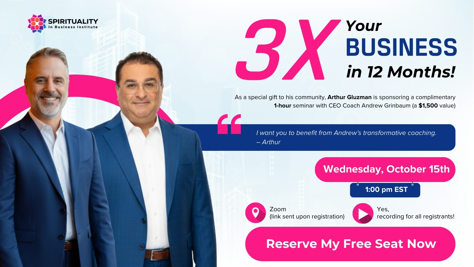 Normally $1,500 —Yours is an exclusive complimentary for being part of Arthur's community also seats are limited.
